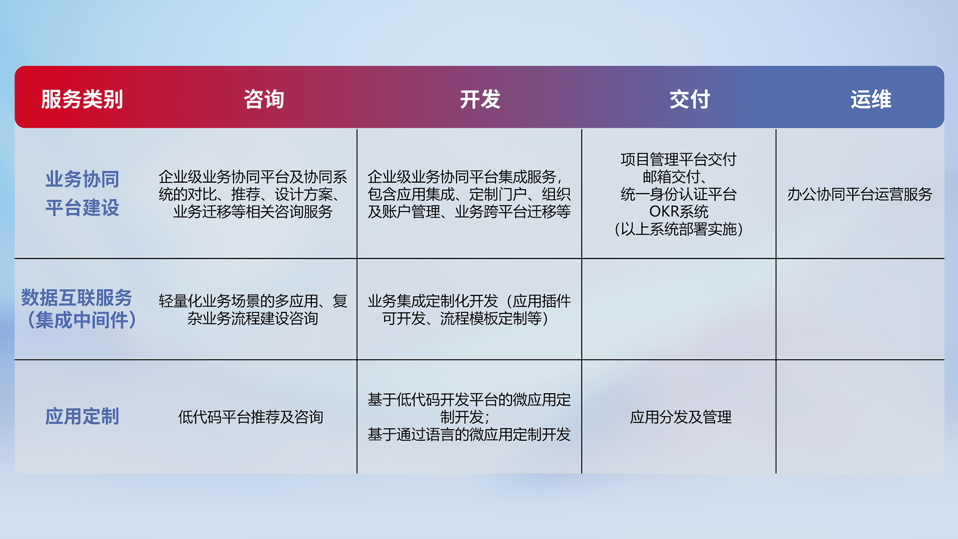针对钉钉、、、、企微、、、IDaas等平台级产品提供产品的规划、、、方案、、、、交付、、、、定制化开发等服务,,实现如统一协同办公、、、、智能客户服务、、、混合会议管理、、、、智能数据查询、、、等业务场景,,,,实现数字化转型。。。。